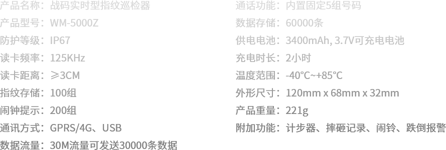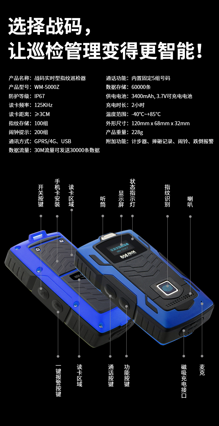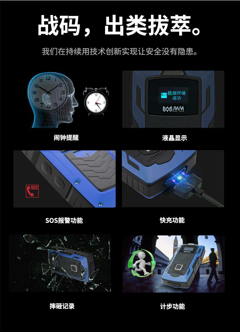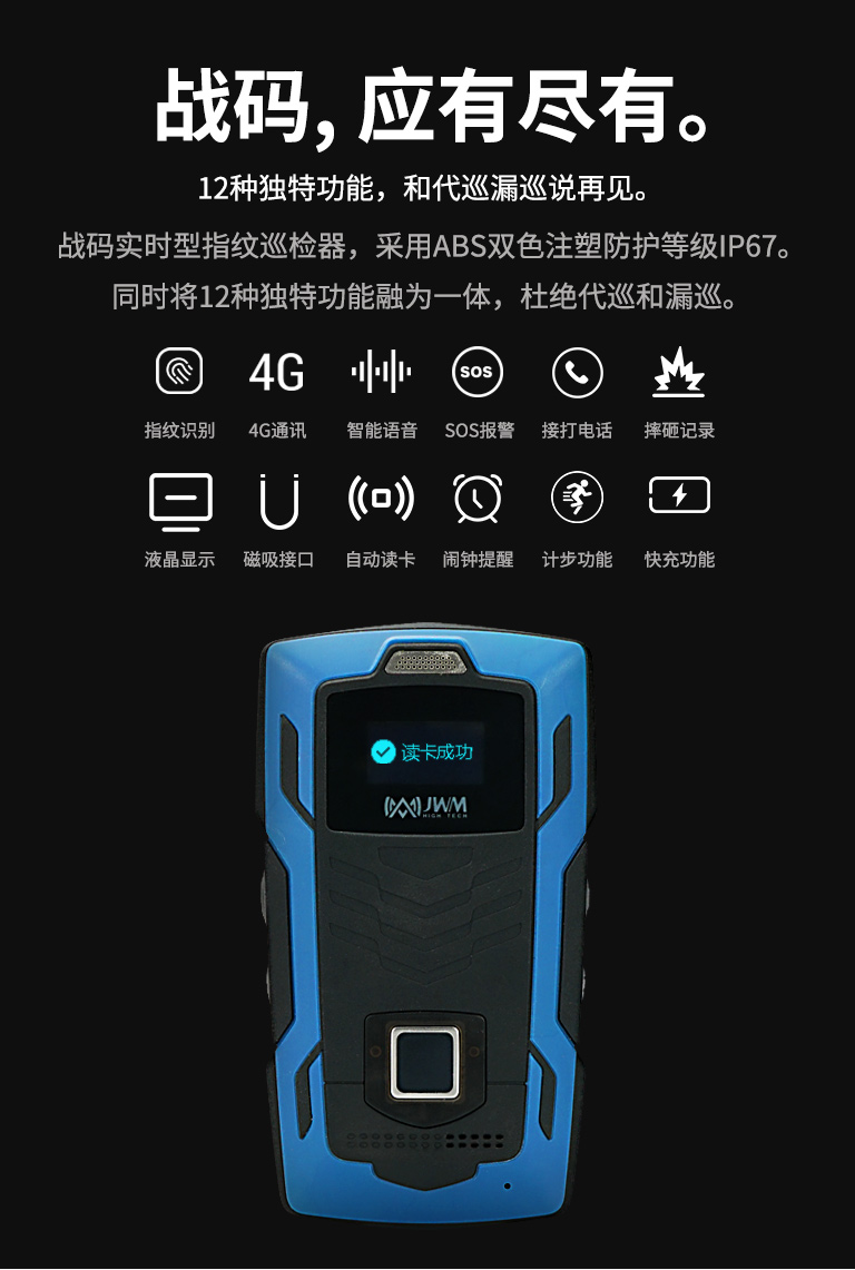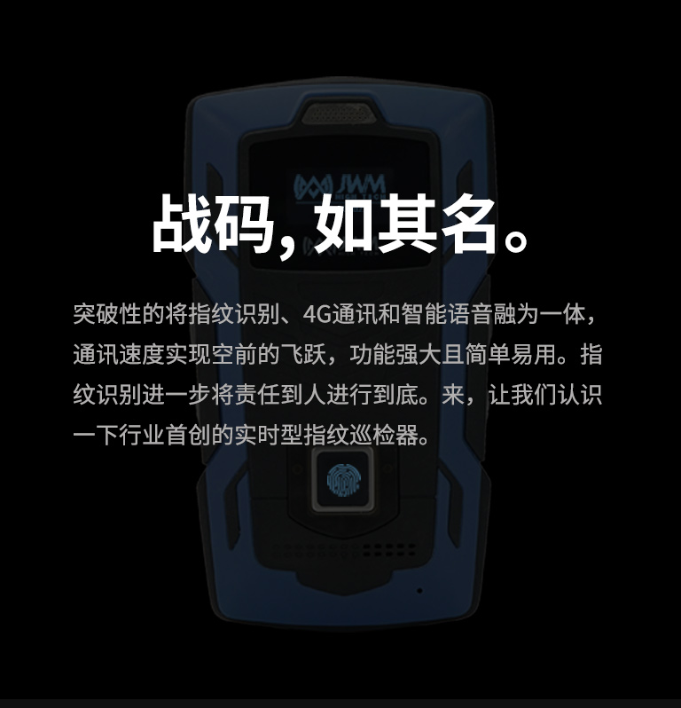 突破性的將指紋識別、4G通訊和智能語音融為一體,通訊速度實現空前的飛躍,功能強大且簡單易用。指紋識別進一步將責任到人進行到底。來,讓我們認識一下行業首創的戰碼指紋實時巡檢器。