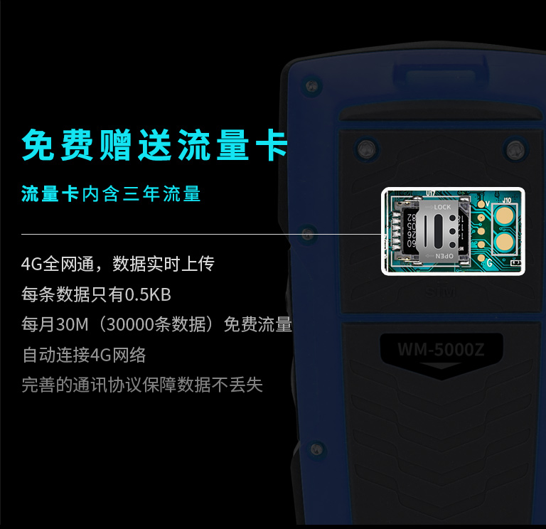 4G全網通,數據實時上傳每條數據只有0.5KB每月30M(30000條數據)免費流量自動連接4G網絡完善的通訊協議保障數據不丟失