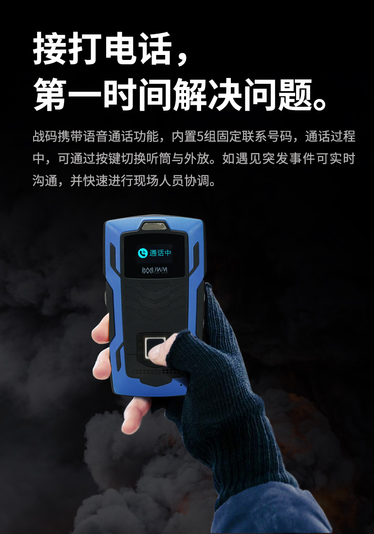 戰碼攜帶語音通話功能,內存5組固定聯系號碼,通話過程中,可通過按鍵切換聽筒與外放。如遇見突發事件可實時溝通,并快速進行現場人員協調。